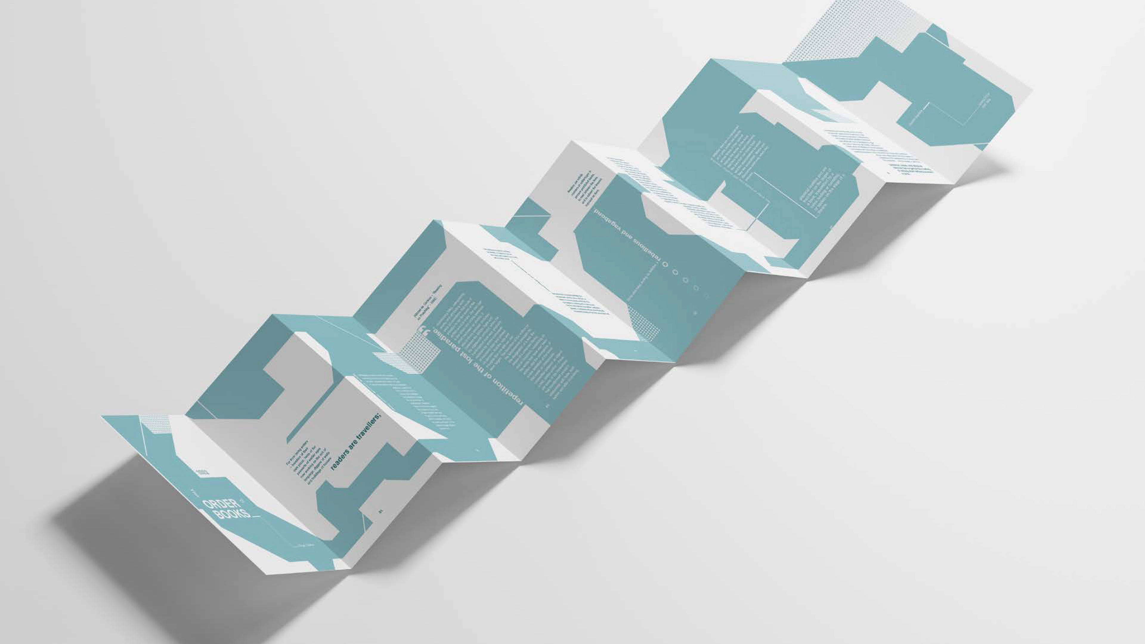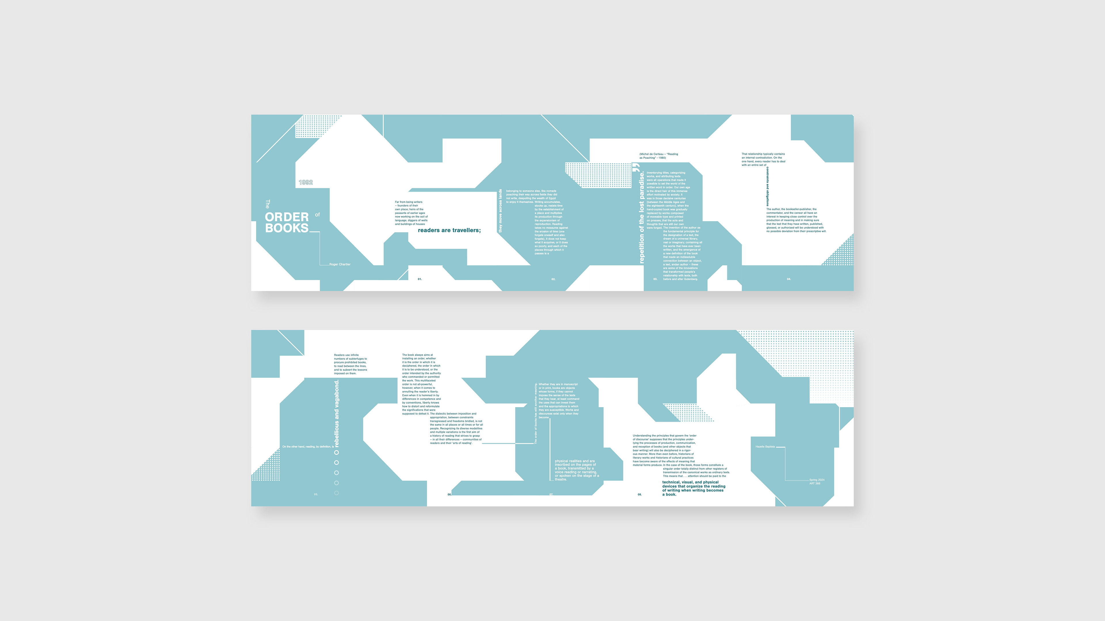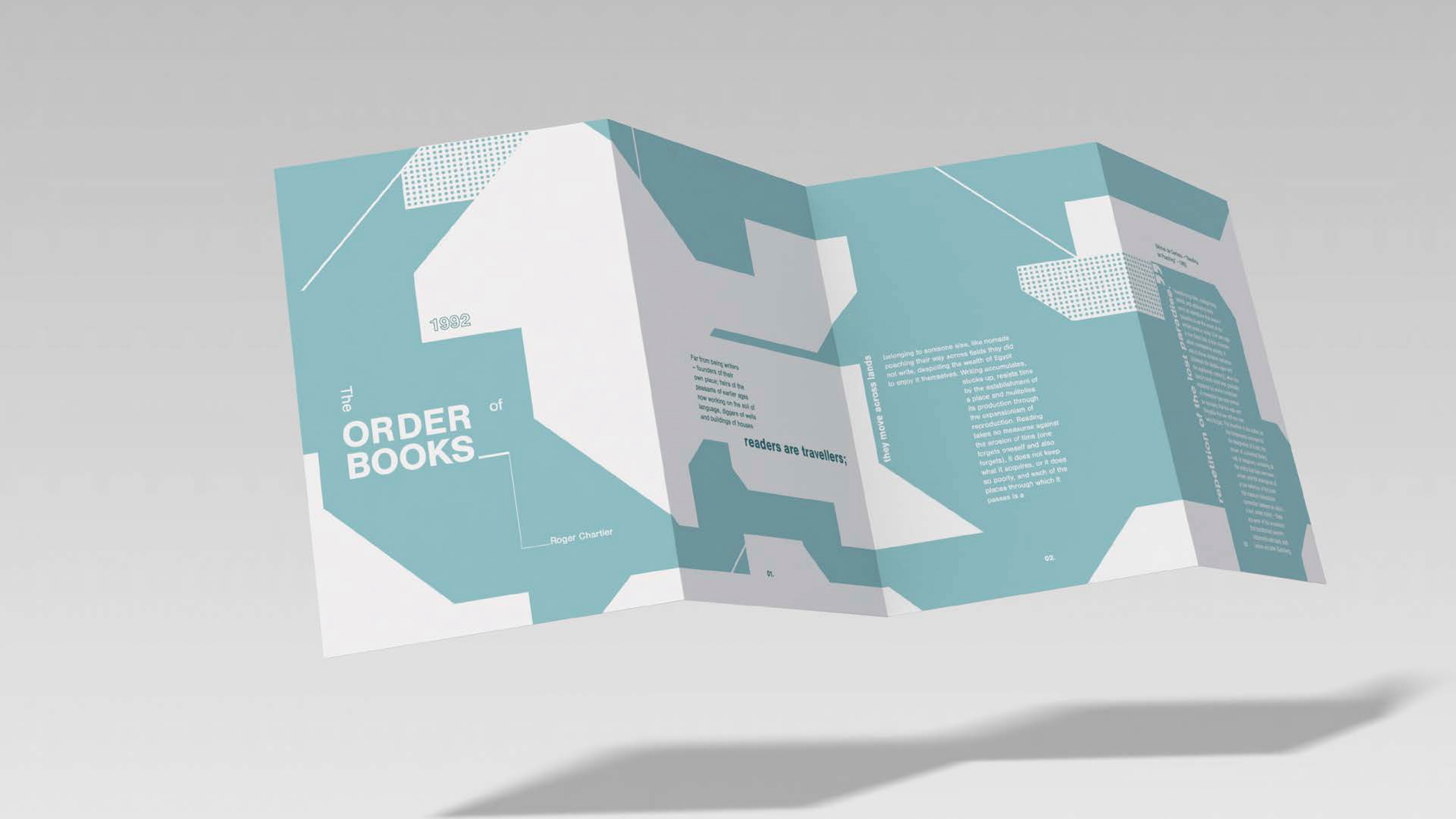 The Order of Books is an accordion-style publication featuring text by Roger Chartier. It explores typographic layout and negative space, applying a consistent grid system across all pages to create visual cohesion and structure.